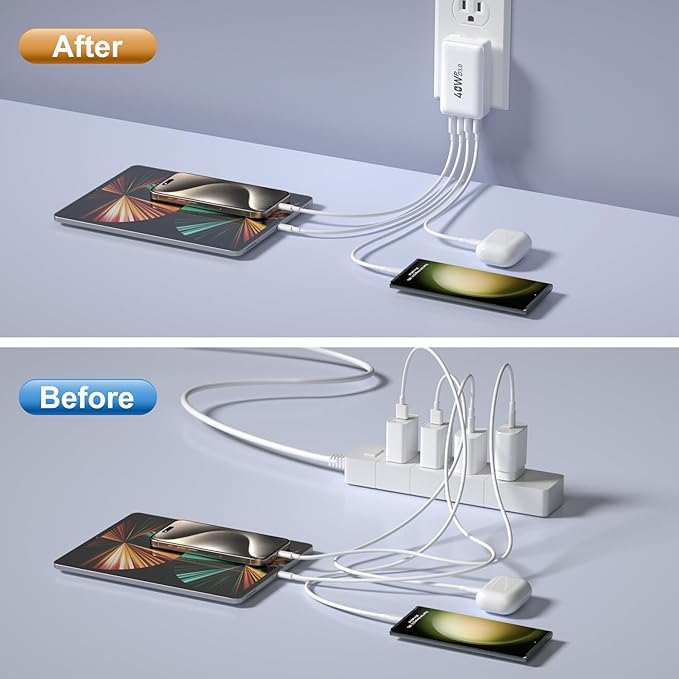 - Multi-ports USB C Wall Charger: This USB C wall charger provide 40W strong power via 2 USB-C ports and 2 USB-A ports,efficiently charging 4 devices simultaneously, works for smartphones, tablets, earbuds, headphones, smartwatches, etc.