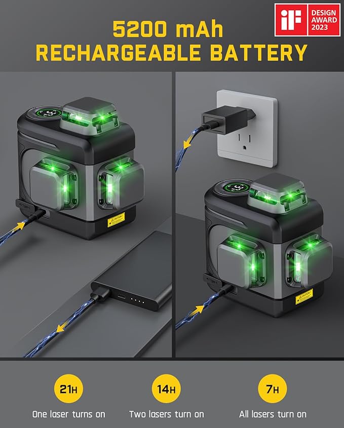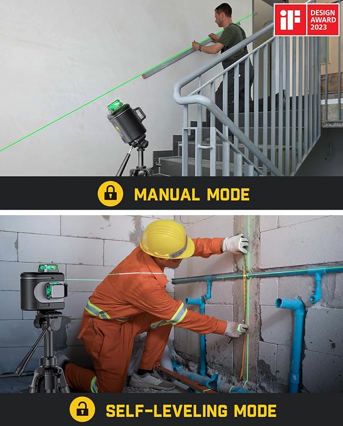 - Automatic and Manual Modes Offer Ultimate Versatility: Based on your home renovation or construction work needs, it automatically or manually adjusts horizontally and indicates any uneven surfaces. In self-leveling mode, this laser auto-levels on surfaces within tilts of 3°. If the surface tilt exceeds 3°, the laser will continuously flash to indicate the need for adjustment