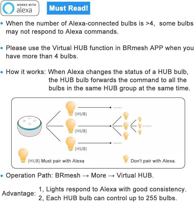 - 【Virtual HUB 】Please use the Virtual HUB function in BRmesh APP when you have more than 4 bulbs, which will effectively solve the problem of multi-light control. It also solves the problem of slow response or even non-response to Alexa voice commands due to the number of Alexa-connected devices. Operation Path: BRmesh → More → Virtual HUB.