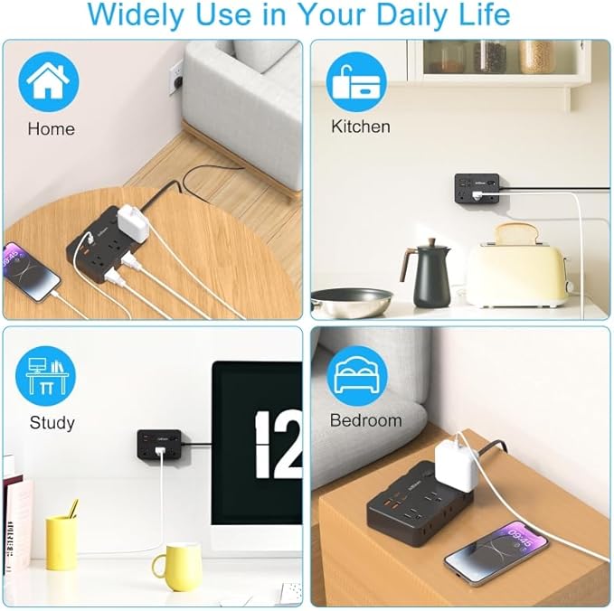 - 【Desk Charging Station & Wall Mountable Design】-This mount power strip can be fixed on the wall or desk by 2 keyhole slots on the back, allow this wall mount power strip to be installed in various applications. With 4 anti-slip rubbers bottom, the power strip can be stable on your desktop or nightstand without slipping off.