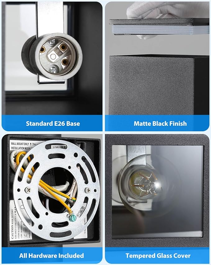 - Aesthetically Pleasing Design: These outdoor sconce lights features a rectangular design that blends modern aesthetics with classic appeal, adding interest to the line patterns of your front porch or outdoor area. The tempered glass cover complements the stylish lamp body, emitting soft, glare-free up and down lighting for a sophisticated ambiance.