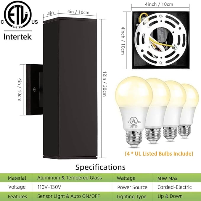 - E26 Base & Bulbs Included: This outdoor sconce light come with two E26 bases support bulbs up to 60W. Included in the package are 3000K warm light bulbs, no need to purchase separately and offer reliable, long-lasting lighting. The easy-to-replace bulbs can be accessed by simply open the glass cover. The input voltage is 120V, suitable for most household.