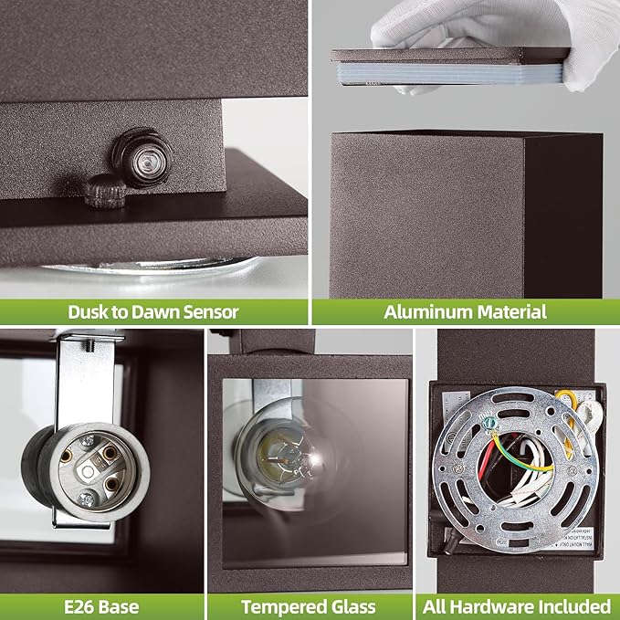 - Aesthetically Pleasing Design: The dusk to dawn outdoor lighting features a rectangular design that blends modern aesthetics with classic appeal, adding interest to the line patterns of your front porch or outdoor area. The tempered glass cover complements the stylish lamp body, emitting soft, glare-free up and down lighting for a sophisticated ambiance.