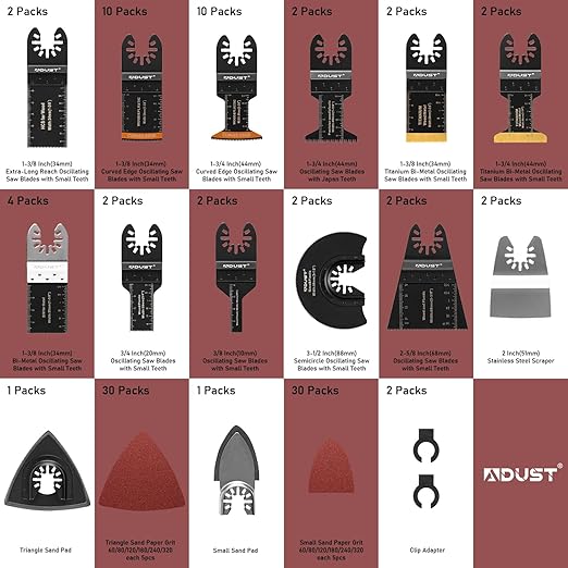 - Universal Work With Oscillating Power Tools: Adust's universal fit system of multitool blades are compatible with most major brands of oscillating tools and saws for cutting wood, such as Dewalt, Fein Multimaster, Ryobi, Milwaukee, Hitachi, Black & Decker, Chicago, Craftsman and More (Exception: Fein Starlock,Bosch MX30, Fein Supercut, Dremel MM40 & MM45 and Dremel Multi Max 6300)