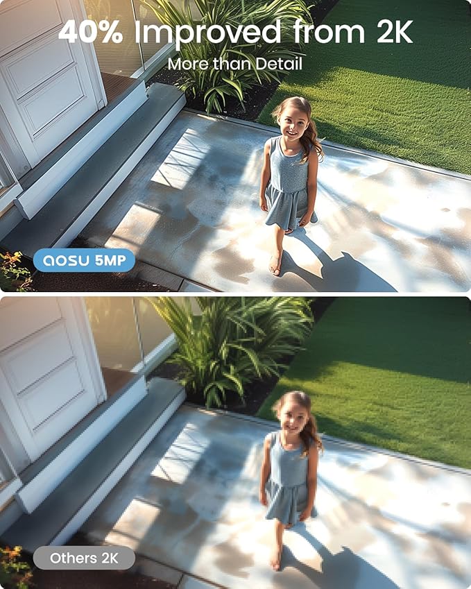 - 5MP High-Definition Clarity: Experience unparalleled 5MP UHD quality, a 40% improvement over traditional 2K systems. The Aosu Outdoor Security Camera captures every detail in vivid color, ensuring crystal-clear visuals day and night.