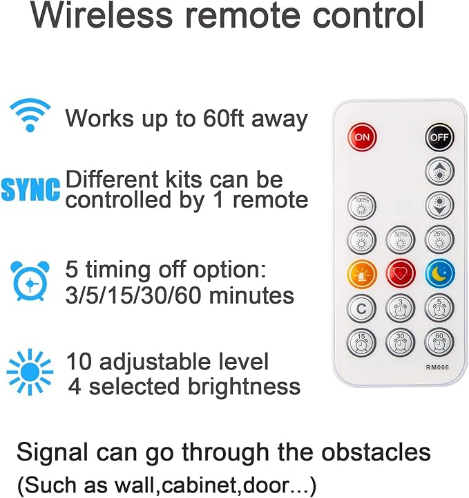 - RF Wireless remote control:17-Key RF remote has timing off,dimming, hot buttons,rematch and dynamic function,60 feet control distance