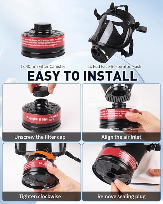 - Package Includes: 1 x Full Face Respirator Mask, 1 x 40mm Filter Canister.