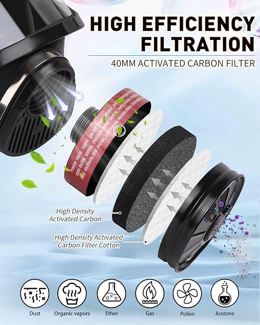 - Powerful Filtration System: The full face cover is equipped with a standard 40mm filter, which is replaceable and composed of activated carbon and electrostatic filter cotton. Comes with the super efficiency filter, 99.97% filtering efficiency. It's easy to filter out the vapors and harmful particulates in the air, providing a reliable protection for your health