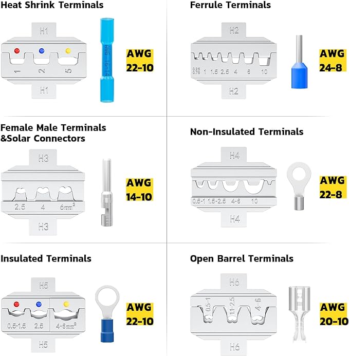 - 【Multi-Function Crimping Tool】 The wire crimping tool kit comes with 6 types of interchangeable crimping dies set, and with this crimping dies set you can confidently tackle various connectors, including heat shrink connectors 22-10AWG, insulated connectors 22-10AWG,non-insulated connectors 22-8AWG, open barrel connectors 20-10AWG, ferrule terminals 24-8AWG, and female/male terminals & solar connectors 14-10AWG. Perfect to meet the daily work needs of electricians and family daily needs