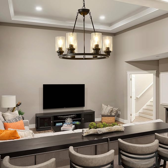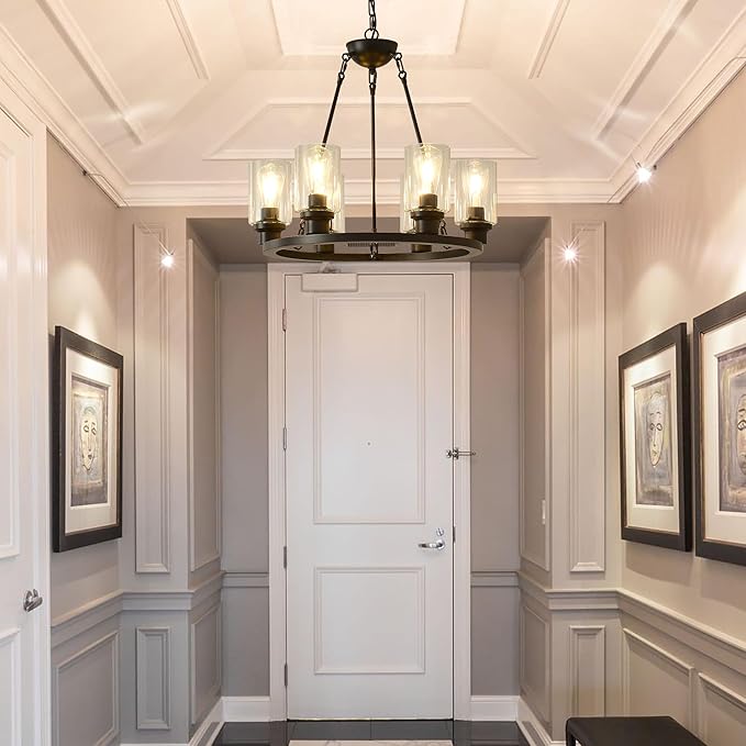 - 【farmhouse lighting fixtures ceiling】This 6-Light Wagon Wheel Pendant with Clear Cylindrical Glass Shade exudes a rustic vintage vibe. Offering 360° of light coverage.
