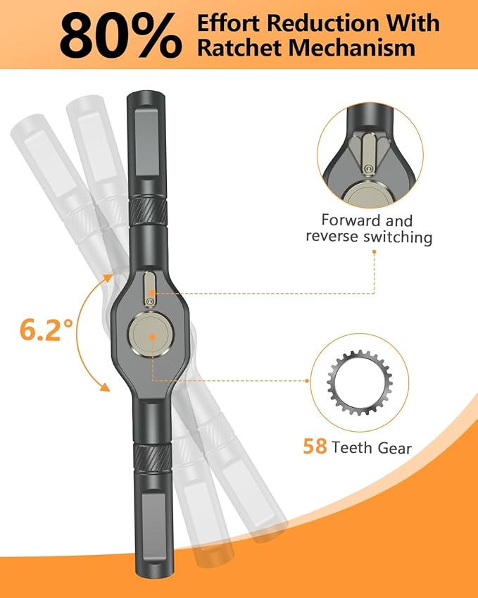 - Ratchet Flexible Design: It adopts forward and reverse ratchet structure design, the torque is 50N.m/50KG, saving 80% of the effort, and there is no need to adjust the wrist position; in addition, it can be flexibly disassembled and combined, and the usage can be converted, and it can be used as a screwdriver or a small wrench , very convenient and practical