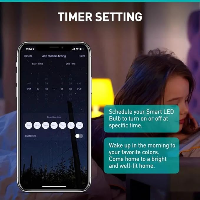 - ⏰【Timer Control】This A19 smart light bulb can be timed to switch on and off via APP, allowing you to fall asleep in your favourite colour and wake up in your favourite colour, helping you to end a tiring day/start a beautiful new day.