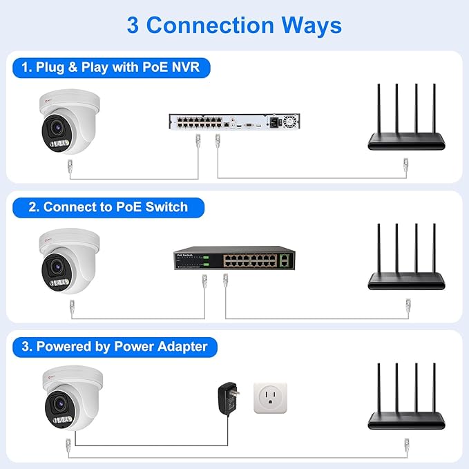 - Three Night Vision Modes: This ptz ip camera comes standard with smart dual-light night vision by default, activating two built-in spotlights when it detects a moving person or vehicle, providing color night vision and detailed information or acting as a powerful deterrent to intruders. You can also choose infrared night vision (up to 130 ft) or full color night vision (up to 98 ft).