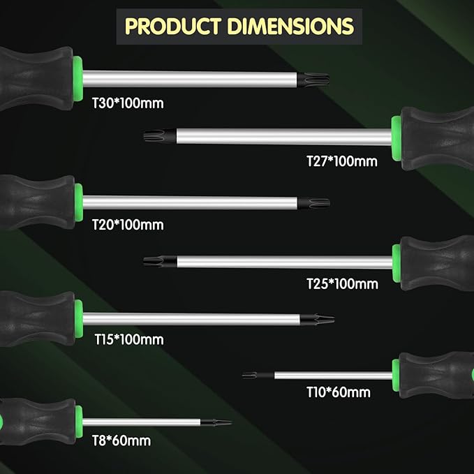 - Set Includes: T8*60MM,T10*60MM,T15*100MM,T20*100MM,T25*100MM,T27*100MM,T30*100MM.