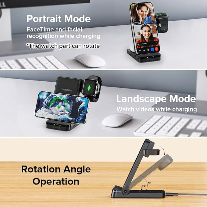 - Portable & Foldable Stand Design: The iPhone charging station is foldable, lightweight, and portable, suitable for carrying in bags or suitcases. This wireless charging stand is not only great for home and office use but also for travel and trips. Additionally, it serves as an adjustable-angle phone stand.