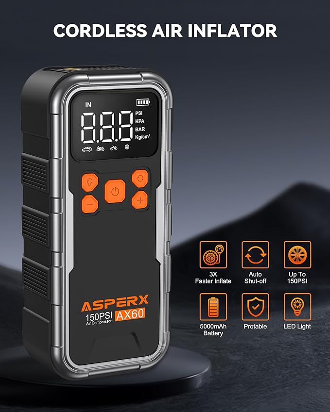 - 【Top-Notch Tire Inflator!】The Portable Tire Inflator Air Compressor is a must-have for your car, motorcycle, bicycle or just for your home! This 3X faster, 150PSI cordless air pump is incredibly efficient and easy to use. The built-in tire gauge pressure ensures accurate inflation every time, and the LED light is a thoughtful addition for nighttime use. This portable air compressor is a must-have for anyone on the go, combining speed, power, and convenience in one compact package!