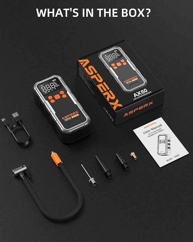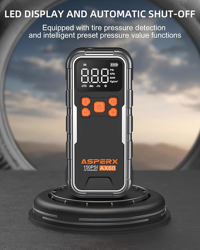 - 【4+N Modes Air Compressor】AX60 portable car tire pump provides 4 preset inflation modes (SUV, car, bicycle, ball) for user convenience. Additionally, manual mode allows you to set the desired pressure between 3-150 psi depending on the inflator.