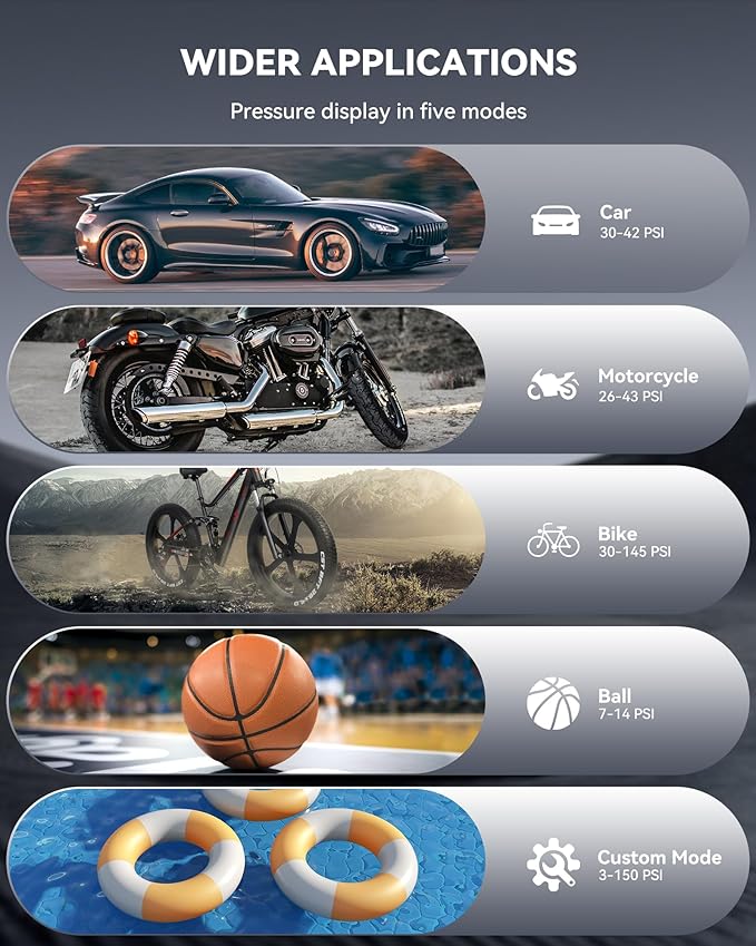 - 【4+N Modes Air Compressor】AX60 portable car tire pump provides 4 preset inflation modes (SUV, car, bicycle, ball) for user convenience. Additionally, manual mode allows you to set the desired pressure between 3-150 psi depending on the inflator.