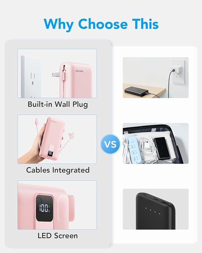 - Say goodbye to tangled wires and multiple chargers with the Charmast Portable Charger. Its built-in cables and wall plug make it compatible with all phones, so you can travel light without worrying about charging woes with this battery pack.