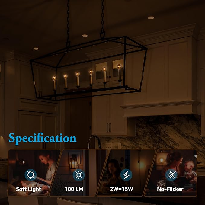 - √ Vintage Charm with a Soft Glow: Embrace the timeless appeal of our amber 15w chandelier light bulbs. Encased in amber glass, these vintage bulbs emit a warm, no-flicker E12 led amber light bulb that creates a cozy and inviting ambiance. The 2000K dimmable feature allows you to adjust the brightness effortlessly, providing a comfortable atmosphere for any occasion.