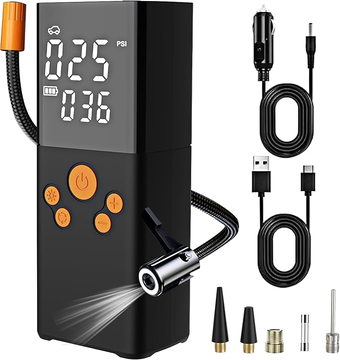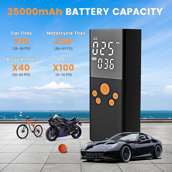 - Air Compressor:Portable Air Compressor, in addition to its inflation capability, it integrates emergency lighting and portable power functions. It offers three lighting modes: spotlight, strobe, and SOS signal. Equipped with 2000mAhx3 capacity, the air pressure pump for car tire lasts for 3 hours of continuous use and can be fully charged in just 5-6 hours, and the tire air compressor can be used in two ways, either wirelessly or using the car cord to inflate when the battery runs out.This air compressor has a small volume, light weight, does not occupy space and easy to carry, suitable for outdoor and travel use.