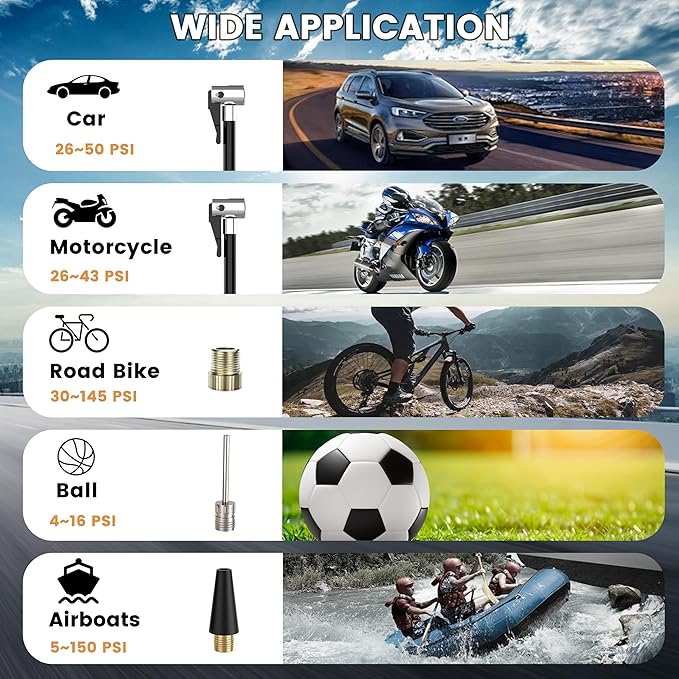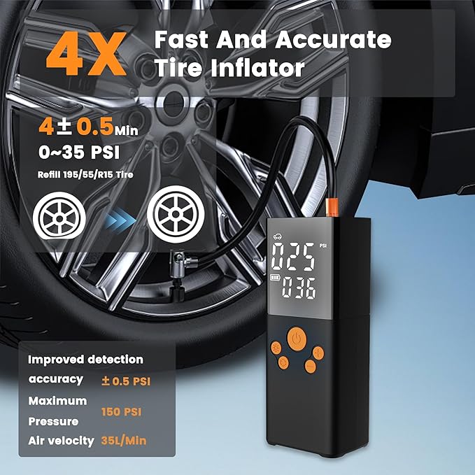 - 4X Fast Air Pump for Car Tires:The car tire air pump has powerful functions and is very practical! The inflation speed of 36L/Min ensures efficient and fast filling of car tires, and inflating 195/65/R15 car tires from 0psi to 35psi can be completed in less than 5 minutes. And it has a precision guarantee of ± 1%, making the inflation process more accurate and reliable. In addition, it also has the function of preset and monitoring tire pressure, and can automatically turn off when the set pressure is reached, so you don't have to worry about over-inflation.