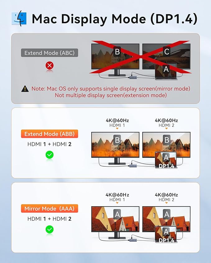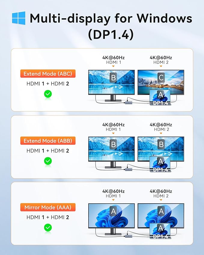 - Dual 4K HDMI Display Monitor for Laptop Docking Station: USB-C Hub use 2 HDMI port to enter mirror mode for usb c laptops or extended mode and transfer 4K@60Hz HD video with 3D effect from laptop screen to a monitor, projector, HDTV, etc. Support both SST and MST mode. Support dual display for your windows laptops. 2 HDMI ports can be used simultaneously, resolution up to 4K@60Hz. Please note that Mac OS only support mirror mode without extended mode