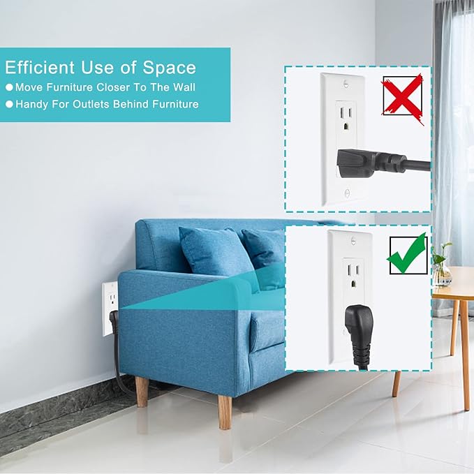 - 90° Low Profile Flat Head: The flat head design of this extension cord makes it easy to fit into tight spaces and outlets, saving valuable space and keeping your surroundings clutter-free.