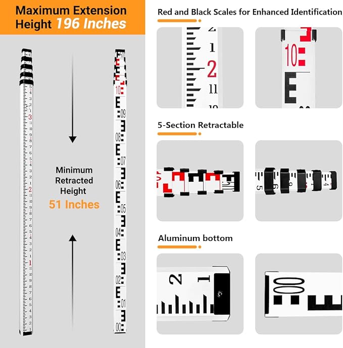 - EXTENDABLE: This high quality leveling rod is 1+/-0.05mm thick, and its five adjustable telescopic sections reach up to 5 Meters and collapse to 51 inches. Its rectangular shape ensures easy handling as well as flush alignment with flat surfaces