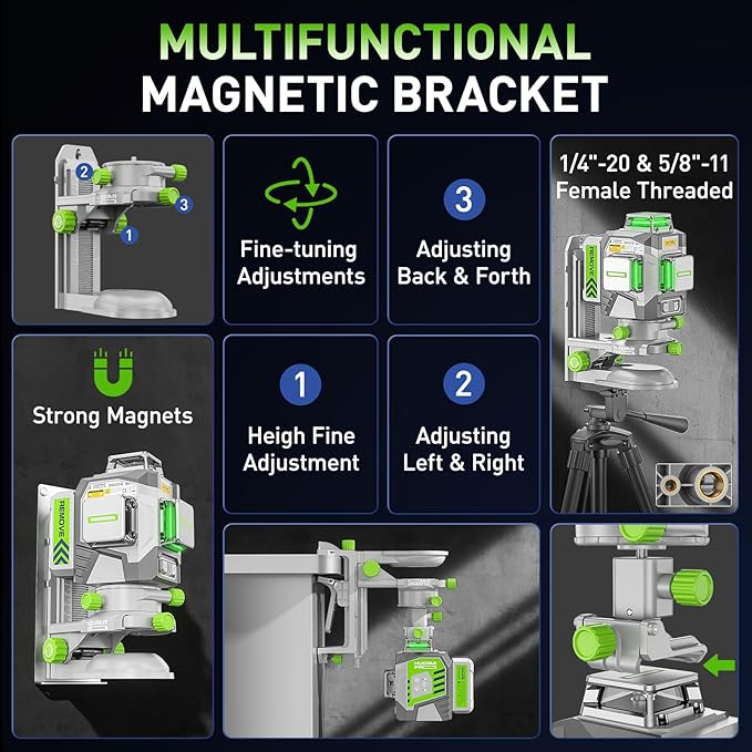 - 【Remote Control & Magnetic Bracket】With remote control, turn on/off pulse mode, switch three laser lines at a distance up to 32.8Ft. Magnetic bracket offers quick positioning on metal surfaces with fine-tuning knobs to adjust laser line up & down, left & right, back & forth, and rotate 360°. The bracket has 1/4"-20 and 5/8"-11 threaded mounts on bottom to be used with tripods or pole mounts. The green laser level tool also has 1/4"-20 mount thread to suit a tripod or pole mount.