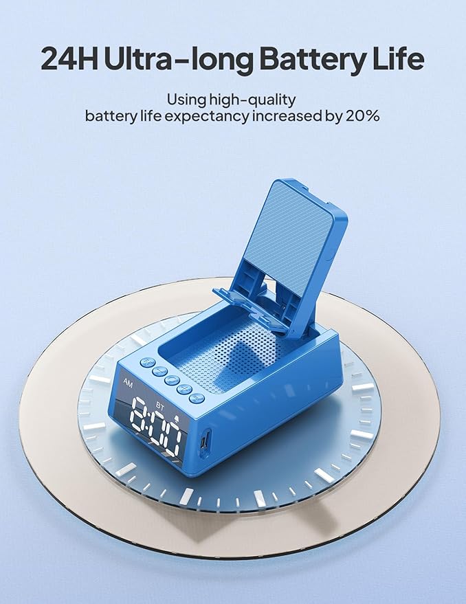 - 3 In 1 Design: A multifunctional, stylish and cool small object that combines a Bluetooth speaker, clock and mobile phone stand. It adopts streamline and round corner design, beautiful and generous. The rotating bracket greatly enhances the viewing experience, ensuring all angles of usage requirements. Adopt stereophonic sound effect. Lower bass is more mellow, higher pitch is clearer, so you can also experience the ultimate cinema feeling at home. It's the perfect gift for yourself and others.