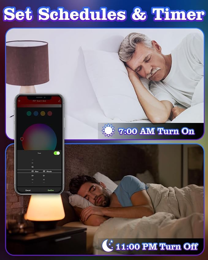 - Set Schedule Color Light Bulb: Set the smart e12 led light bulbs to come on in the morning, wake up by a smooth light. Set the lights turn off gradually in the night, so you never have to worry whether you've left any energy saving light bulbs on.