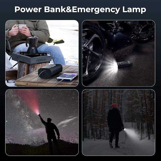 - 【3 in 1 Device 】 Inflator, Power Bank and Flashlight. - In addition to serving as an portable air compressor, you can use it to charge your mobile phone, bicycle light, switching mechanism battery, etc. The top LED light (3 light modes) of this air pump which can be provided convenience for you to inflate and change tires in the dark, or warn other vehicles at night.
