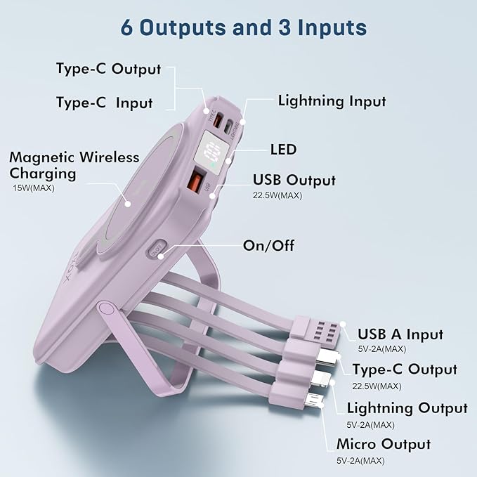 Wireless Portable Charger 10000mAh,Magnetic Power Bank with Built-in Cables LED Display,22.5W PD Fast Charging for Magsafe Battery Pack Compatible with iPhone16/15/14/13/12/Pro/Pro Max(Purple)