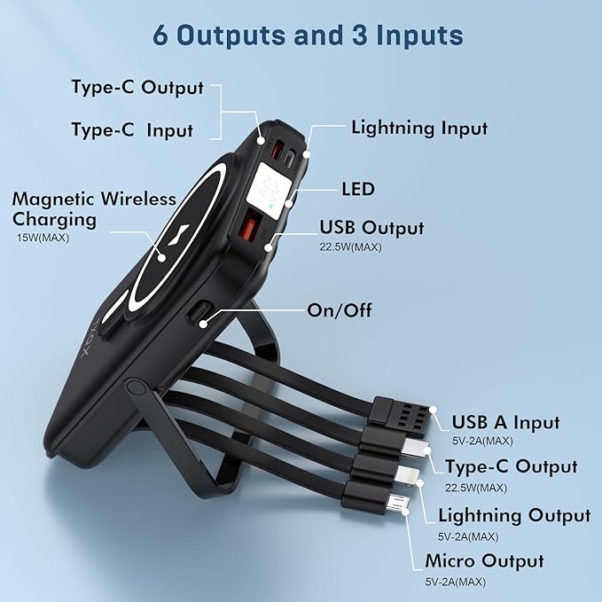 - 【6 Outputs and 3 Inputs】Wireless Portable charger has 6 outputs and 3 inputs, you may charge 6 devices max at the same time, recharge battery pack with 3 input options easily. Magnetic wireless charger built-in 3 output cables and 2 outputs port(1 USB-C port and 1 USB-A port) and 1 magnetic wireless charging (Total 6 outputs), great for multi electronics users who has iPhone, android or micro devices. It also built-in 3 inputs (1 built-in USB-A recharging cord/cable, 1 USB-C input, 1 iPhone input), which you can use any one of them to recharge Magnetic battery pack conveniently.