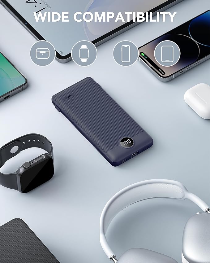 - [High Capacity & Universal Compatibility] Boasting a 10,000mAh capacity, this USB-C portable charger can power your devices 2.5 to 4 times on a single charge, depending on the device. It's compatible with iPhones, Android devices, and most USB-C enabled gadgets using the built-in cables.