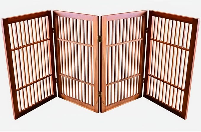 - Our folding pet gates can easily be stored when not being used. Crafted from sturdy acacia wood, this gate offers a secure and practical solution for containing your pets. When unfolded into a wide Z-shape, it stands freely and can be placed in doorways, entryways, halls, bedrooms, or even staircases. Its decorative design adds a touch of elegance to your home while ensuring your dog, puppy, or other pets remain safely confined.