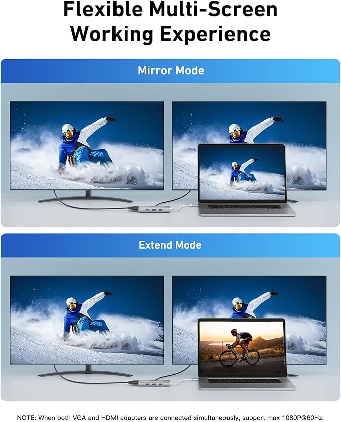 - [Expand Your Display Options] The USB dock enables dual-display functionality for your laptop by simultaneously connecting to both VGA and HDMI.It offers both MIRROR and EXTEND modes, enhancing the efficiency of your work.(Note: Supports a maximum resolution of 1080P@60Hz)
