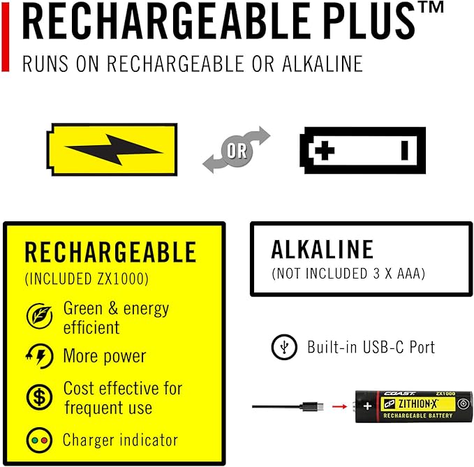 - RECHARGEABLE-DUAL POWER: Each coast Rechargeable-Dual Power product comes with a ZITHION-X rechargeable battery and is compatible with either Coast Extreme Performance alkaline batteries or other brand-name battery types, depending on the product. This provides you the cost savings of using rechargeable and the flexibility of reverting to alkaline