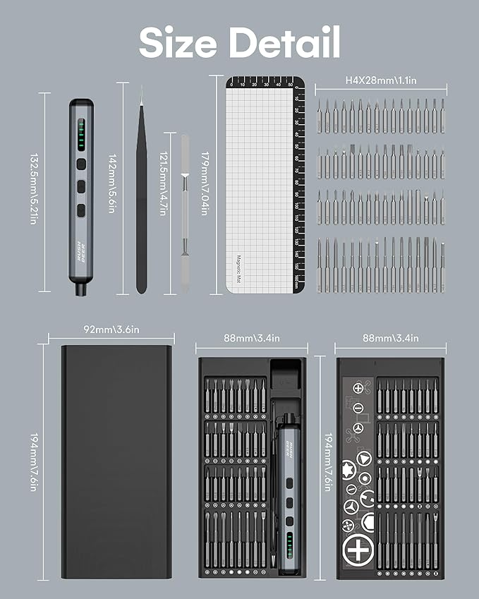 - What you get: 1*Mini Electric Screwdriver, 64*Precision Screwdriver Bits, 1*USB Type-C Charging Cable,1*Tweezer, 1*Pry Bar 1*User Manual.