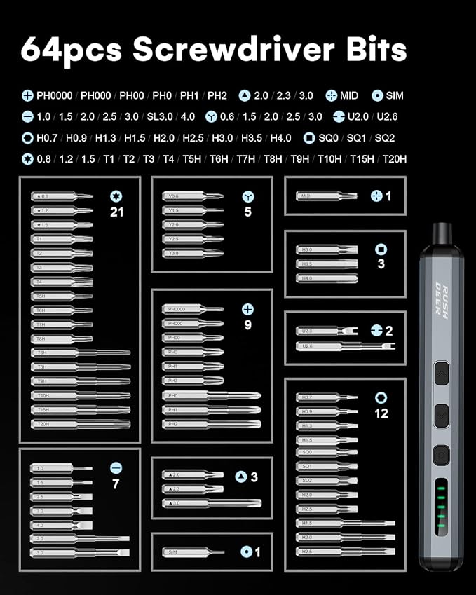 - Comprehensive Set: This electric screwdriver comes with a comprehensive collection of 64 magnetic bits made of S2 Steel, covering 10 categories, allowing you to tackle various screwdriving scenarios. No matter the task, you'll have the right bit at your fingertips for versatile usage.