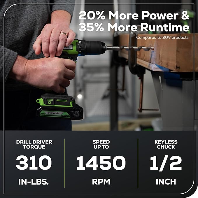 Greenworks 24V Brushless Cordless Drill Kit, 310 in./lbs, 18+1 Position Clutch, 1/2 '' Keyless Chuck, Variable Speed, Battery With 2A Charger, LED Light