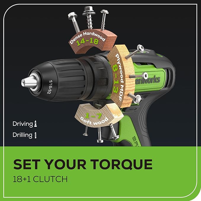 - 【1/2 In. Drill Driver】 2 speed transmission (0-380RPM/0-1450RPM), 310 in-lbs (35Nm) torque, 18 + 1 position clutch with 1/2 in. Keyless chuck offers precise speed control and torque adjustment when drilling holes and driving screws on different surfaces.