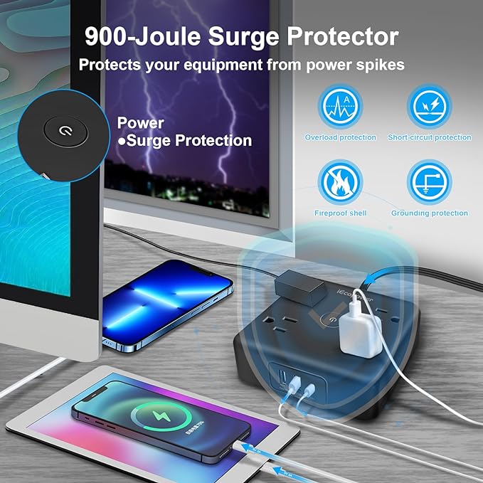 - 【7 in 1 Desktop 15 ft surge protector power strip】-With 4 AC outlets and 3 USB ports(1 USB C Port), this USB power strip can charge up to 7 devices simultaneously with no more than 1250W/10A. The built-in smart IC chip automatically adjusts and provides optimal charging speed for your electronic devices with USB power output up to 2.4A/port, USB C port MAX 5V/3A, 15W total.