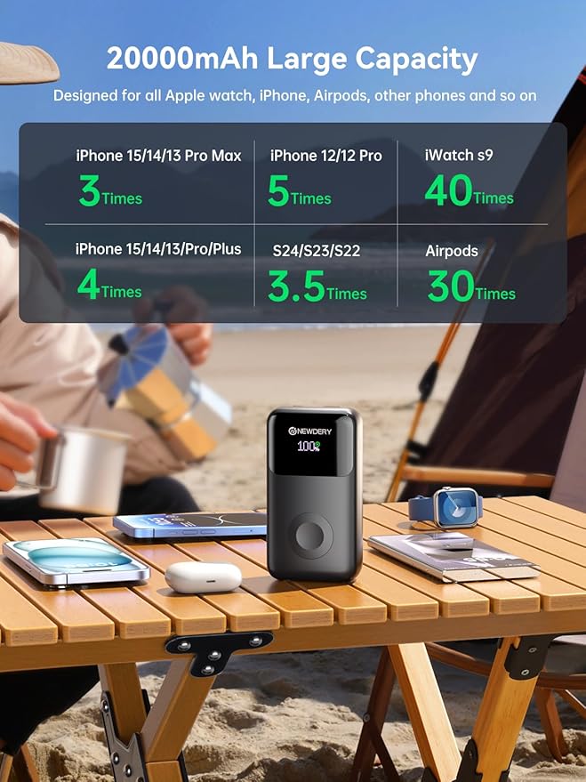 - 【Powerful 20000mAh Battery Pack】The power bank own 20000mAh capacity battery, provides enough juice to charge your devices multiple times,The portable phone charger can charge for iPhone 15 Pro Max to 3 times, for iPhone 15 Pro to 4 times, S24 to 3 times, for iWatch S9 40 times and for AirPods to 30 times. It can charge devices while itself being charged.
