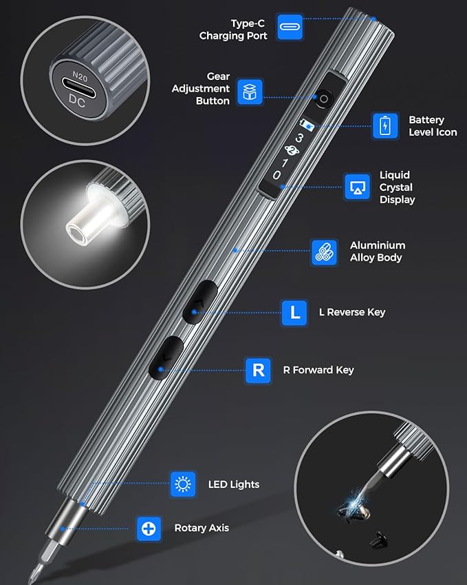 - 【Advanced Digital Torque Control】Experience unmatched precision with our 3-gear torque control system. Choose from 0.1N.m to 0.35N.m to suit any project. With an easy-to-read digital display and a built-in indicator light, you can effortlessly adjust torque settings and monitor the battery level, ensuring you have the right power for every job. The forward and reverse button lets you switch directions in a snap, boosting your efficiency during repairs.