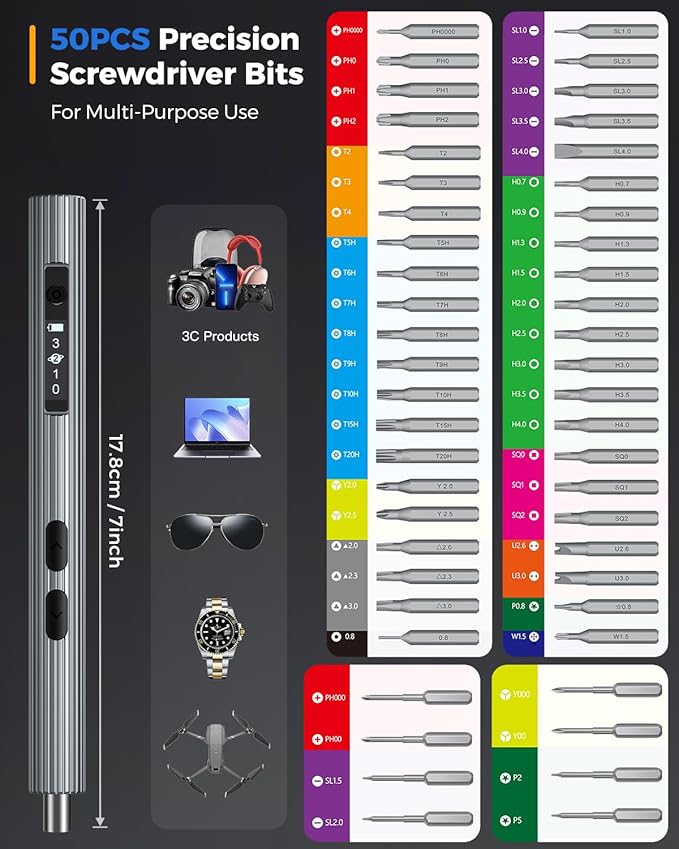 - 【Versatile & Powerful 58-in-1 Precision Electric Screwdriver Set】Packed with 50 high-quality S2 steel bits, this precision screwdriver set provides everything you need to tackle a wide variety of repairs. Whether it's fixing your tablet, phone, camera, or even delicate items like glasses and watches, this tool is designed for precision, durability, and versatility. Perfect for hobbyists and professionals alike.