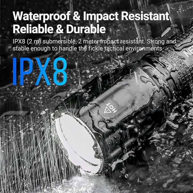- 【WATERPROOF & INDESTRUCTIBLE QUALITY】NEXTORCH high quality tactical flashlight is waterproof and drop-proof, reliable and durable. 2 meters drop-proof, IPX8 (2 meters) waterproof, more comprehensive for more peace of mind! The surface treatment hard anodized aircraft grade aluminum alloy material makes this flashlight sturdy and stable enough to handle changing tactical environments as a law enforcement flashlight.