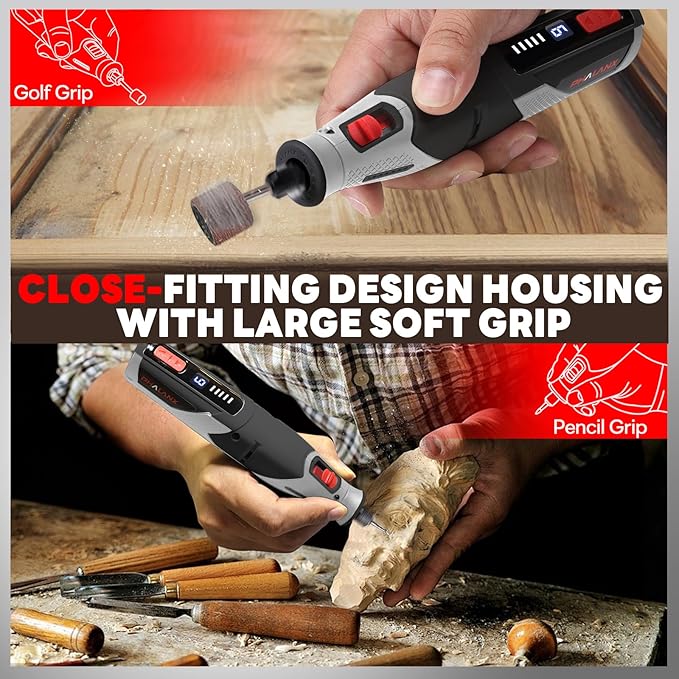 - ๐๐จ๐ฆ๐ฉ๐๐๐ญ ๐๐๐ฌ๐ฒ ๐๐ซ๐ข๐ฉ & ๐๐ซ๐ ๐จ๐ง๐จ๐ฆ๐ข๐ ๐๐๐ฌ๐ข๐ ๐ง:The sanding tools for tight spaces boast a compact body design, lightweight construction, and easy grip. The ergonomically designed body fits snugly in the palm of your hand and is enveloped in a generous area of non-slip soft rubber. With its comfortable grip and enhanced control, the cordless rotary tool kit is ideal for delicate tasks, ensuring you won't feel overly fatigued or sore even after prolonged use.