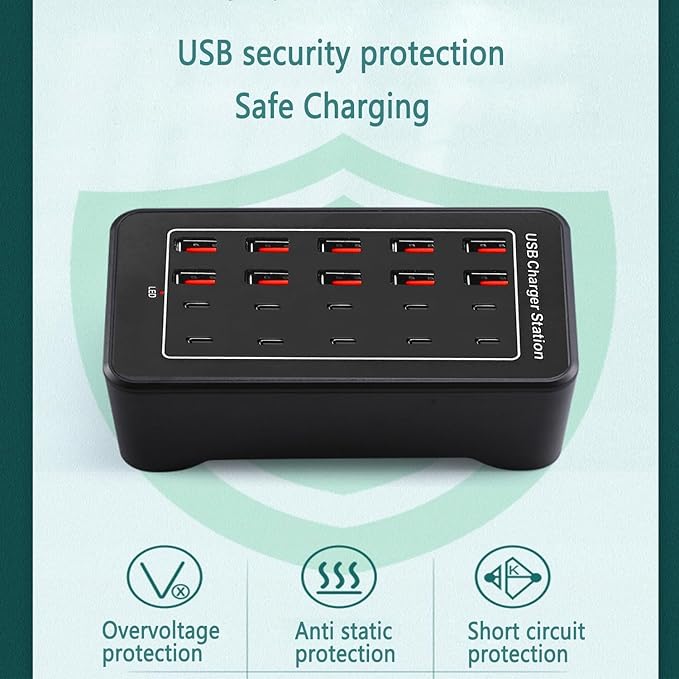 - ๐Multi-port USB charger station: 20 ports usb c fast charger, with 10port usb charger + 10 port usb c charger, working efficiency reaches 80%, total output power is 100W. USB C Charger Compatible with iPhone 15/14/13/12/11/Xs/XS Max/XR/X/8/7/ 6s/Plus, iPad Pro/Air 2/Mini, USB Fast Charger Compatible with Samsung Galaxy S23/S22/S21/S20/S10/S9/S8/S7/Edge/Plus, Note 8/7, LG Nexus, HTC and More.